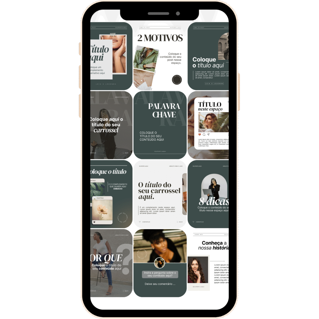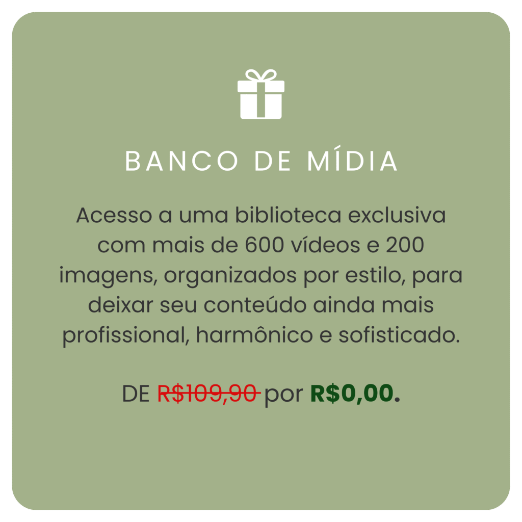 E tem mais: junto com os templates, você recebe um roteiro de conteúdo completo para feed e stories, com ideias de postagens, legendas e direcionamentos que facilitam sua rotina e mantêm seu perfil sempre ativo e profissional.