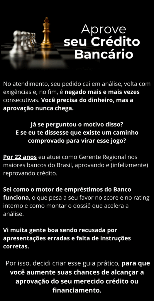 Aviso importante: este material não concede crédito nem promete aprovação. Ele ensina a organizar, comprovar e apresentar seu pedido com método e profissionalismo — aumentando suas chances reais em qualquer banco.